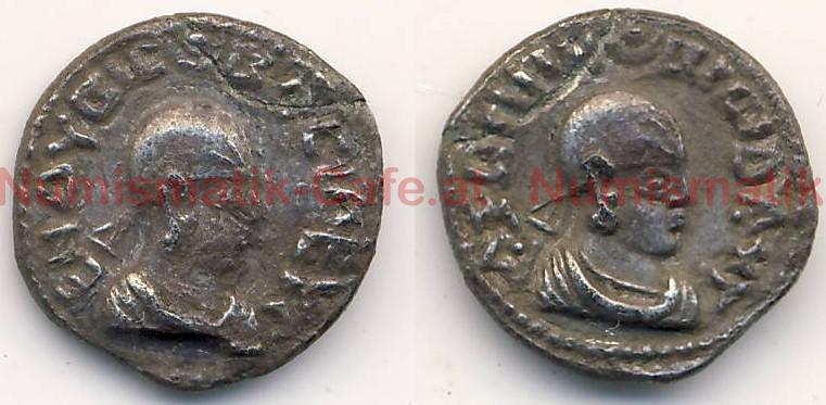 | Bildbeschreibung: | Endubis ca. AD 270 - 290 Legende der Vorderseite: ENDYBIC / liegende Mondsichel mit Sonne darüber / BACILEYC (Endubis König) Legende der Rückseite: AXWMITW / liegende Mondsichel mit Sonne darüber / BICIDAXY (der Axumiten von Dakhu) Ag 2,27 g 14,2 - 14,4 mm Hahn # 2 MH # 2 Bei den Silbermünzen des Endubis ist der Eindruck von Güssen besonders stark, weil sie wegen des hohen Reliefs wahrscheinlich vorgegossen und erst dann geprägt worden sind. Die Kupfer- und Billonmünzen des Endubis wurden sogar ausschließlich gegossen. Die Silbermünzen sind Zeitgenossen der Silbermünzen Diokletians. Viele Informationen zu diesen Münzen verdanke ich Herrn Prof. Dr. Wolfgang Hahn. Die Münze wurde freundlicherweise von Münzenputzer gereinigt! Vielen Dank! |