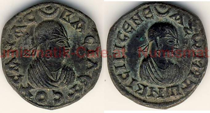 | Bildbeschreibung: | Ousanas ca. AD 320 - 345 1. Regierungszeit (ca. AD 320-334) Vorderseite: BACIΛЄYC OYCANAC / Halbmond und Sonne Rückseite: AXWMITWN BICIΓICENE / Halbmond und Sonne Ag 1,73 g 14,0 - 14,9 mm Hahn # 13b MH # 26 |