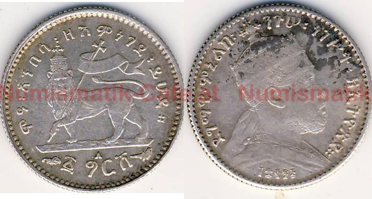 | Bildbeschreibung: | Kaiserreich Äthiopien Prinz Josua V. EE 1906 - 1909 (AD 1913 - 1916) Menelik II. EE 1882 - 1909 (AD 1889 - 1913) 1 Gersch EE 1895 (AD 1902) Münzstätte Paris, 46.000.000 für #M16, #Y01 und #Z02 zusammen Ag (835), 1,44 g 16,2 mm geriffelter Rand KM # 12 Der letzte Jahrgang dieses Typs wurde von 1903 - 1928 mit eingefrorenem Datum geprägt. Genaue Daten sind nicht bekannt. Eventuell wurde diese Münze also auch zu Beginn des I. Weltkrieges unter Prinz Josua V. (Lij Iyasu) geprägt. Nach der der Besetzung Paris' durch die Deutschen wohl ziemlich sicher nicht mehr. Genaue Unterscheidungen lassen sich nicht machen. Die gezeigten Exemplare unter Menelik, Josua und Judith sind zwar drei verschiedene Münzen, sie sind jedoch nur nach gefühlsmäßiger Stempelabnutzung gewählt. Eine genauere Aussage ist damit nicht verbunden. |