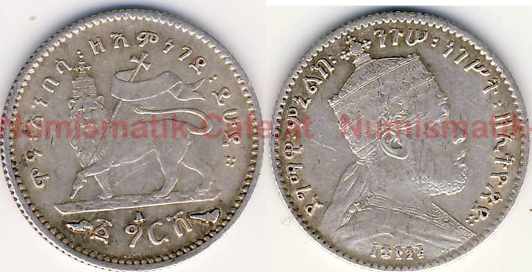 | Bildbeschreibung: | Kaiserreich Äthiopien Zauditu EE 1909 - 1923 (AD 1916 - 1930) Menelik II. EE 1882 - 1909 (AD 1889 - 1913) 1 Gersch EE 1895 (AD 1902) Münzstätte Paris, 46.000.000 für #M16, #Y01 und #Z02 zusammen Ag (835), 1,41 g 16,1 mm geriffelter Rand KM # 12 Der letzte Jahrgang dieses Typs wurde von 1903 - 1928 mit eingefrorenem Datum geprägt. Genaue Daten sind nicht bekannt. Mit Sicherheit wurde diese Münze auch während der Herrschaft Zauditus weitergeprägt. Genaue Unterscheidungen lassen sich nicht machen. Die gezeigten Exemplare unter Menelik, Jasu und Zauditu sind zwar drei verschiedene Münzen, sie sind jedoch nur nach gefühlsmäßiger Stempelabnutzung gewählt. Eine genauere Aussage ist damit nicht verbunden. |