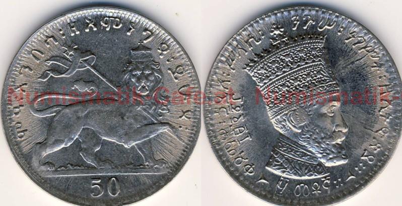 | Bildbeschreibung: | Kaiserreich Äthiopien Haile Selassie EE 1923 - 1967 (AD 1930 - 1974) 1. Regierungszeit EE 1923 - 1928 (AD 1930 - 1935) 50 Matonyas EE 1923 (AD 1930) Münzstätte Addis Abeba, 1.621.256 für #HS08 und #HS09 zusammen (falls der Angabe der Auflage nur die nach Äthiopien gelieferten Ronden zu Grunde liegen, nur für #HS08) Ni 6,92 g 26,8 mm, glatter Rand KM # 31 Die Schlieren auf der Wertseite sind typisch für die Nickelprägungen aus Addis Abeba. |