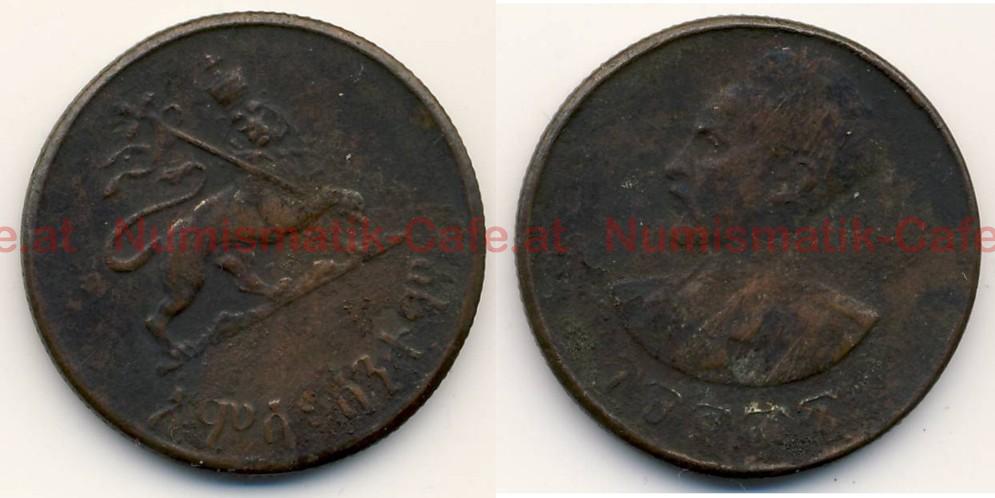 | Bildbeschreibung: | Kaiserreich Äthiopien Haile Selassie EE 1923 - 1967 (AD 1930 - 1974) 2. Regierungszeit EE 1934 - 1967 (AD 1941 - 1974) Äthiopische Währung EE 1937 - 1967 (AD 1944 - 1967) 50 Santeem EE 1936 (AD 1943) KM # - unter S#33 erwähnt Gill # - Münzstätte lokal Cu (ev. früher einmal versilbert), 7,47 g 24,9 mm, geriffelter Rand, 2,1 mm dick Dieses Stück weist winzige helle Flecken, vermutlich Reste einer Silberplattierung, auf. |