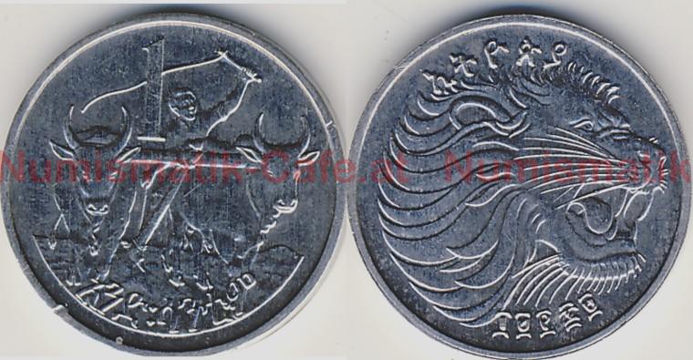 | Bildbeschreibung: | Sozialistisches Äthiopien EE 1969 - 1980 (AD 1977 - 1987) 1 Santeem EE 1969 (AD 1977) Münzstätte Llantrisant Al 0,59 g 17,1 mm, glatter Rand KM #43.1 Die Kursmünzen von EE 1969 wurden in - mindestens - drei verschiedenen Münzstätten geprägt. Die Stücke in Polierter Platte kommen aus Middletown, PA (Franklin Mint). Bei diesen Münzen ist zwischen der Nasenspitze des Löwen und dem Rand der Münze nur ein minimaler Abstand. Bei den Umlaufmünzen, die - mindestens - in Llantrisant und Berlin geprägt wurden, ist ein deutlicher Abstand zu sehen. Bei den Stücken aus Llantrisant enden über dem mittleren Zeichen der Jahreszahl, der Hundert, zwei der unteren Schnurrbarthaare links und rechts, bei den Stücken aus Berlin endet nur ein Schnurrbarthaar über der Mitte der Hundert. Von den Stücken aus Llantrisant gibt es - mindestens - zwei Varianten. Bei der oben gezeigten - vermutlich jüngeren - sind die beiden kurzen Mähnenhaare oberhalb der unteren Schnurrbarthaare schmal und wulstig, bei der ersten Variante (#SÄ02) sind sie breit und flächig. Auch die kurzen Locken der Mähne oben auf dem Kopf unterscheiden sich leicht in der Anordnung. Wegen dieser Variante wurde angenommen, dass auch noch weitere Münzstätten im Spiel sein könnten, sie lässt sich aber auch durch ein Nachschneiden der Stempel erklären. #SÄ02b zeigt nämlich ein Exemplar der 1. Variante mit schwächer werdenden Mähnenhaaren, die das Nachschneiden notwendig erscheinen ließen. |