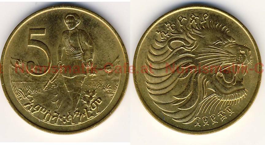 | Bildbeschreibung: | Sozialistisches Äthiopien EE 1969 - 1980 (AD 1977 - 1987) 5 Santeem EE 1969 (AD 1977) Münzstätte Llantrisant Cu-Zn 3,08 g 20,05 mm, glatter Rand KM #44.1 Die Kursmünzen von EE 1969 wurden in - mindestens - drei verschiedenen Münzstätten geprägt. Die Stücke in Polierter Platte kommen aus Middletown, PA (Franklin Mint). Bei diesen Münzen ist zwischen der Nasenspitze des Löwen und dem Rand der Münze nur ein minimaler Abstand. Bei den Umlaufmünzen, die - mindestens - in Llantrisant und Berlin geprägt wurden, ist ein deutlicher Abstand zu sehen. Bei den Stücken aus Llantrisant enden über dem mittleren Zeichen der Jahreszahl, der Hundert, zwei der unteren Schnurrbarthaare links und rechts, bei den Stücken aus Berlin endet nur ein Schnurrbarthaar über der Mitte der Hundert. |