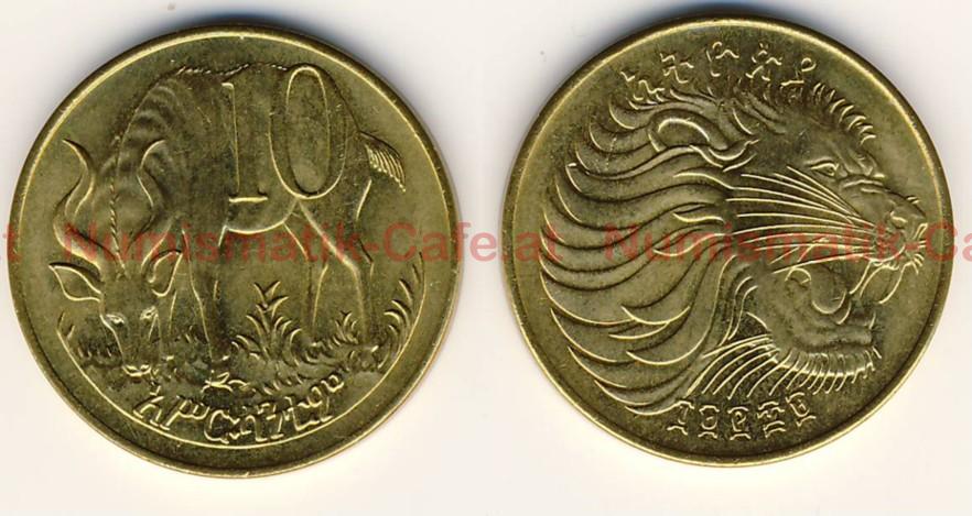 | Bildbeschreibung: | Sozialistisches Äthiopien EE 1969 - 1980 (AD 1977 - 1987) 10 Santeem EE 1969 (AD 1977) Münzstätte Llantrisant Cu-Zn 4,57 g 23,00 mm, glatter Rand KM #45.1 Die Kursmünzen von EE 1969 wurden in - mindestens - drei verschiedenen Münzstätten geprägt. Die Stücke in Polierter Platte kommen aus Middletown, PA (Franklin Mint). Bei diesen Münzen ist zwischen der Nasenspitze des Löwen und dem Rand der Münze nur ein minimaler Abstand. Bei den Umlaufmünzen, die - mindestens - in Llantrisant und Berlin geprägt wurden, ist ein deutlicher Abstand zu sehen. Bei den Stücken aus Llantrisant enden über dem mittleren Zeichen der Jahreszahl, der Hundert, zwei der unteren Schnurrbarthaare links und rechts, bei den Stücken aus Berlin endet nur ein Schnurrbarthaar über der Mitte der Hundert. |