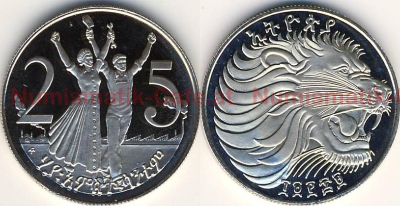 | Bildbeschreibung: | Sozialistisches Äthiopien EE 1969 - 1980 (AD 1977 - 1987) 25 Santeem EE 1969 (AD 1977) Münzstätte Middletown, 11.724 Cu-Ni 3,72 g 21,55 mm, geriffelter Rand KM #46.3 Die Kursmünzen von EE 1969 wurden in - mindestens - drei verschiedenen Münzstätten geprägt. Die Stücke in Polierter Platte kommen aus Middletown, PA (Franklin Mint). Bei diesen Münzen ist zwischen der Nasenspitze des Löwen und dem Rand der Münze nur ein minimaler Abstand. Bei den Umlaufmünzen, die - mindestens - in Llantrisant und Berlin geprägt wurden, ist ein deutlicher Abstand zu sehen. |