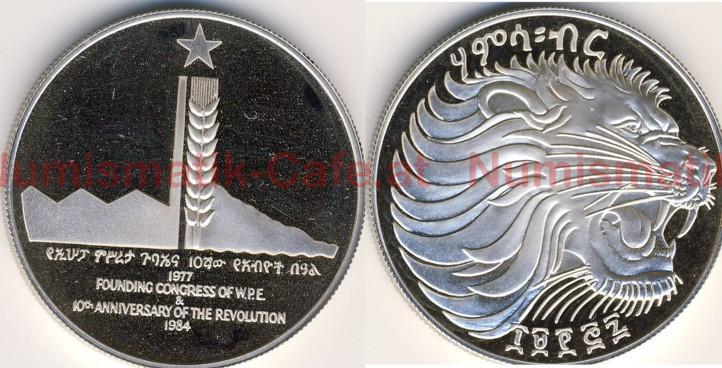 | Bildbeschreibung: | Sozialistisches Äthiopien EE 1969 - 1980 (AD 1977 - 1987) 50 Birr EE 1977 (AD 1984) Münzstätte Llantrisant max 1.000 Ag (925) 28,20 g (ein anderes Stück: 27,84 g) 38,6 mm geriffelter Rand Zum Gründungskongresses der Arbeiterpartei Äthiopiens (W.P.E) und zum 10. Jahrestag der Revolution wurden eine Gedenkmünzen zu 50 Birr ausgegeben. Sie wurden von der Royal Mint in Llantrisant geprägt. Diese Münze war bei den Sammlern lange bekannt, fehlte aber viele Jahre in den Katalogen. Beim Schön ist sie seit 2005 enthalten, bei KM fehlte sie mindestens bis 2004. |