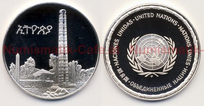 | Bildbeschreibung: | Diese Medaille aus Sterling-Silber wurde AD1979 von den Vereinten Nationen herausgegeben. Jedenfalls geht das aus einem Begleitschreiben hervor. Sie ist offenbar Teil einer Serie "The Medals of the Nations of the World" und trägt darin die Nummer #43. Die Vorderseite zeigt das Stelenfeld von Axum im Norden der Stadt. Die Stele im Vordergrund soll wohl die Grabstätte König Ezanas (ca. AD330-340) abbilden: http://de.wikipedia.org/wiki/Aksum Die Medaille wiegt 11,27 g und mißt im Duchmesser 31,8 mm. Ich hatte ja im letzten Jahr einen Reisebericht zu Äthiopien hier im Cafe eingestellt und dabei auch ein Foto des Stelenfeldes eingebracht. Diese Medaille habe ich jetzt auch nachträglich in diesen Beitrag eingefügt: viewtopic.php?f=51&t=1372&start=0 Das in diesem Reisebericht erwähnte kleine Museum auf dem Stelen-Gelände ist auf der Medaille besser zu erkennen als auf meinem Foto. Diese Medaille war übrigens in eine Art "Ersttagsbrief" eingebunden. Daraus habe ich sie herausgepopelt. Einen Scan des Umschlages incl. Medaille poste ich unter #SÄ38a. |