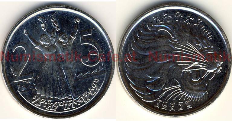 | Bildbeschreibung: | Demokratische Bundesrepublik EE 1984 - heute (AD 1991 - heute) 25 Santim EE 1996 (AD 2003) Münzstätte Royal Canadian Mint (Ottawa, Hull, Winnipeg) Stahl, Ni-galv. 3,29 g 21,5 mm, geriffelter Rand Seit EE 1996 werden die Typen der Kursmünzen von EE 1969 wieder mit aktuellen Jahreszahlen nachgeprägt. Bei den Stücken zu 25 und 50 Santim Serie von EE 1996 ist von den Schnurrbarthaaren her zu vermuten, dass sie Berlin geprägt wurden, laut WMK wurden sie jedoch von der Royal Canadian Mint hergestellt. |