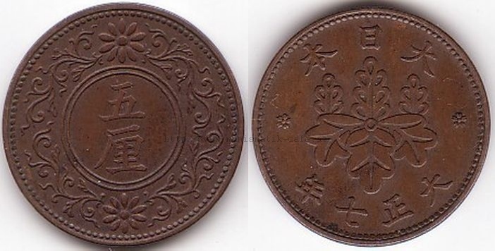 | Bildbeschreibung: | 5 Rin 1918 Blauglockenbaum (Paulownia imperialis) Material: Kupfer 950 / Zinn 40 / Zink 10 Durchmesser: 18,78mm Gewicht: 2,10g Randschrift: Keine Auflage: 11,661,877 Kat.-Nr.: Schön: 19 KM: 41 JNDA: 01-54 |