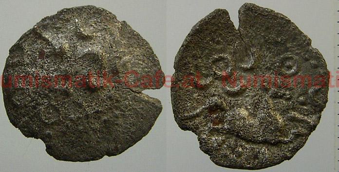| Bildbeschreibung: | Westengland / Dobunni Catti head type class I Van Arsdell 1135-1 silver unit, 0,93 g AV: Kopf (dezentriert) RV: Pferd nach rechts, darüber Ring mit drei Halbmonden und Ring mit Punkt FO: Cleeve Prior - Ex Dr. William F. Blank Collection - CNG, Classical Numismatic Group, Electronic auction 211, 3.6.2009, Lot 48 (Teil) http://www.cngcoins.com/Coin.aspx?CoinID=143162 - Romanorvm, Grafton NSW, Australia http://www.romanorum.com.au/view.asp?ID=3842 Celtic Coin Index: 90.0036 http://www.finds.org.uk/CCI/details.php?coin_num=90.0036 Dieses Exemplar erwähnt in: Philip de Jersey, Gazeteer of findspots of Dobunnic coins. In: Robert D. Van Arsdell, The Coinage of the Dobunni. Money suppley and coin circulation in Dobunnic territory. Sudies in Celtic Coinage 1, Oxford University Committee for Archaeology, Monograph 38, Oxford 1994, 67-84 (S. 81). Coin Register 1989, Nr 53, pl. 21, 53 (dieses Ex.) http://www.britnumsoc.org/publications/Digital%20BNJ/pdfs/1989_BNJ_59_14.pdf |