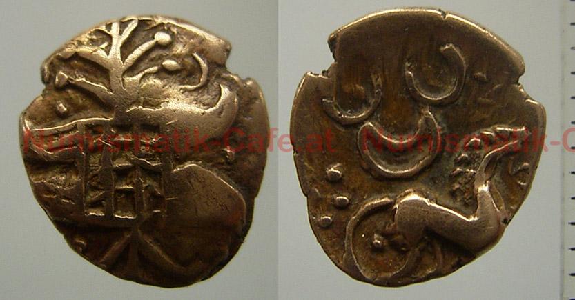 | Bildbeschreibung: | Ostengland / Iceni Irstead quarter stater Van Arsdell 628-1 Gold (mit viel Kupfer), 0,98 g, 10 h Av: Kastenartiges Ornament mit Gittermuster, an beiden Seiten jeweils zwei zipfelförmige Anhängsel, oben und unten zweigartige Gebilde mit Kugelenden Rv: Pferd nach rechts, unter dem Schweif des Pferdes eine Kugel, über dem Pferd drei Halbmonde (bilden ein 'hidden face'), ein Kranz aus Kugeln hinter dem Pferd FO: Essendon, Hertfordshire (August 1998) Celtic Coin Index 99.0555 http://www.finds.org.uk/CCI/details.php?coin_num=99.0555 - Chris Rudd, List 43, 22 - Matthew Rich collection - Dix Noonan Webb, catalogue 97, 7 December 2011, 152 |