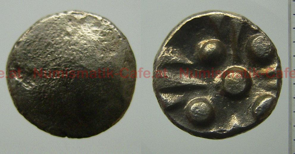 | Bildbeschreibung: | Westnoriker Obol, Gurina-Typ Dembski 839 Ag, 10,2 mm, 0,67 g AV: Glatt mit Prägespuren RV: Linienkreuz mit Zentralpunkt; je 1 Winkellinie, in Punkt endend FO: Im August 2007 zusammen mit zwei weiteren Exemplaren gekauft. Nach Angaben des Verkäufers Fundort nahe Thörl-Maglern-Greuth. |