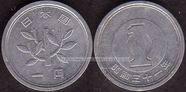 | Bildbeschreibung: | 1 Yen 1956 Material: Aluminium 1000 Durchmesser: 20mm Gewicht: 1,00g Randschrift: keine Auflage: 500.900.000 Kat.-Nr- Schön: 48 KM: 74 JNDA 02-11 |