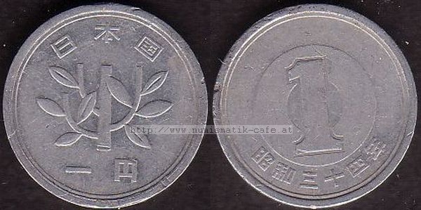 | Bildbeschreibung: | 1 Yen 1959 Material: Aluminium 1000 Durchmesser: 20mm Gewicht: 1,00g Randschrift: keine Auflage: 208.600.000 Kat.-Nr- Schön: 48 KM: 74 JNDA 02-11 |