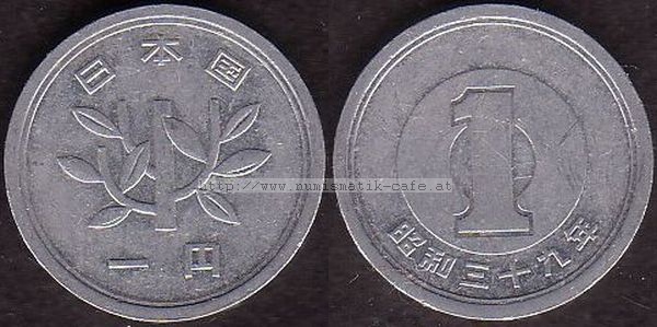 | Bildbeschreibung: | 1 Yen 1964 Material: Aluminium 1000 Durchmesser: 20mm Gewicht: 1,00g Randschrift: keine Auflage: 1.665100.000 Kat.-Nr- Schön: 48 KM: 74 JNDA 02-11 |