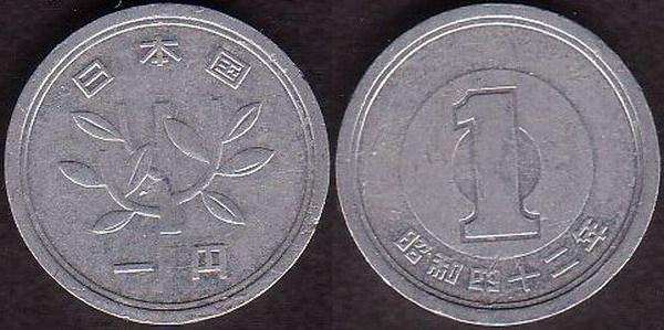 | Bildbeschreibung: | 1 Yen 1967 Material: Aluminium 1000 Durchmesser: 20mm Gewicht: 1,00g Randschrift: keine Auflage: 220.600.000 Kat.-Nr- Schön: 48 KM: 74 JNDA 02-11 |