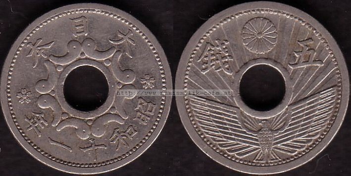 | Bildbeschreibung: | 5 Sen 1936 Material: Nickel 1000 Durchmesser: 19,00mm Gewicht: 2,80g Randschrift: keine Auflage: 36,321,796 Kat.-Nr.: Schön: 32 KM: 53 JNDA: 01-40 |