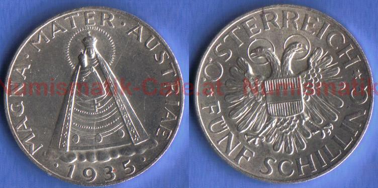 | Bildbeschreibung: | Avers: Stehende Schutzmantelmadonna mit Kind Umschrift: MAGNA. MATER. AUSTRIAE. 1935. Revers: ungekrönter Doppeladler mit Glorienschein und Bindenschild, Umschrift: ÖSTERREICH * FÜNF SCHILLING* Randschrift: FÜNF SCHILLING * * * techn.Daten: 835er Silber, 15 Gramm, Ø 31mm, Dicke 2mm, Jaeger J.445 ANK 34 Münzbild von Kollegen saigerteufe |