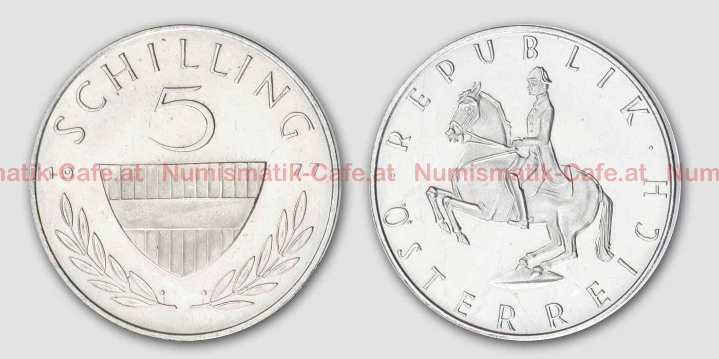 | Bildbeschreibung: | 5 Schilling (K-N), 1977 (1960-1968: 640er-Silber, 5,2g, 23,5mm) 1968-2001 (K-N), 4,8g, 23,5mm, Rand glatt VS: Reiter in Levade in der Spanischen Hofreitschule (Design: Hans Köttensdorfer) RS: Bindenschild, Wertangabe (Design: Josef Köblinger) S#78 ANK#37 KM#2889a |