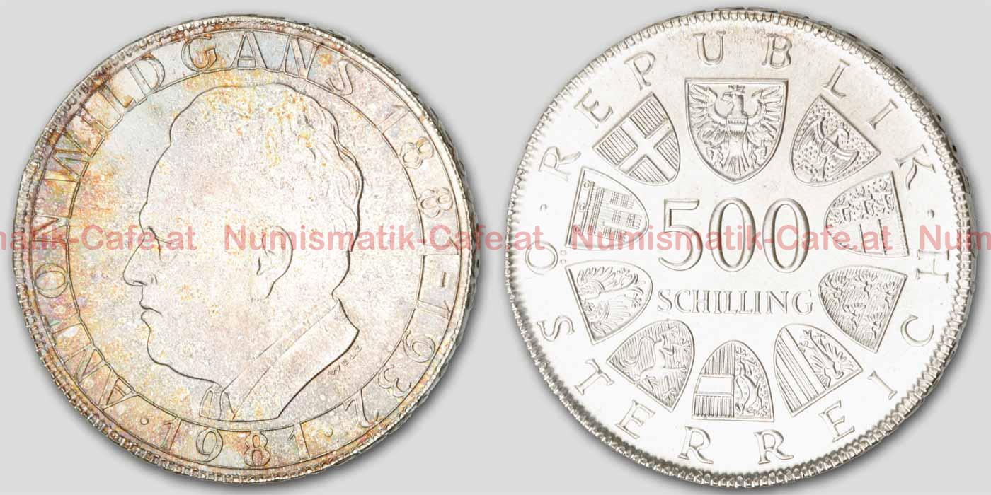 | Bildbeschreibung: | 500 öS, 1981. 100. Geburtstag von Anton Wildgans 24g, 640er-Silber, 37mm VS: Anton Wildgans (1881-1932), Schriftsteller (Design Fedinand Welz) RS: REPUBLIK ÖSTERREICH, 500 Schilling, 9 Landeswappen, Bundeswappen, (Design Edwin Grienauer) S#147 ANK#108 KM#2952 |