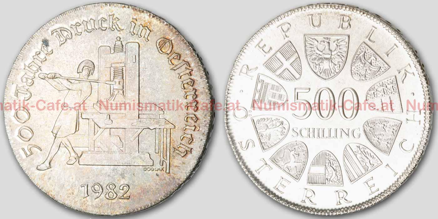 | Bildbeschreibung: | 500 öS, 1982, 500 Jahre Druckhandwerk in Österreich 24g, 640er-Silber, 37mm VS: Alte Druckerpresse (Design: Kurt Bodlak) RS: REPUBLIK ÖSTERREICH, 500 Schilling, 9 Landeswappen, Bundeswappen, (Design Edwin Grienauer) S#151 ANK#112 KM#2957 |