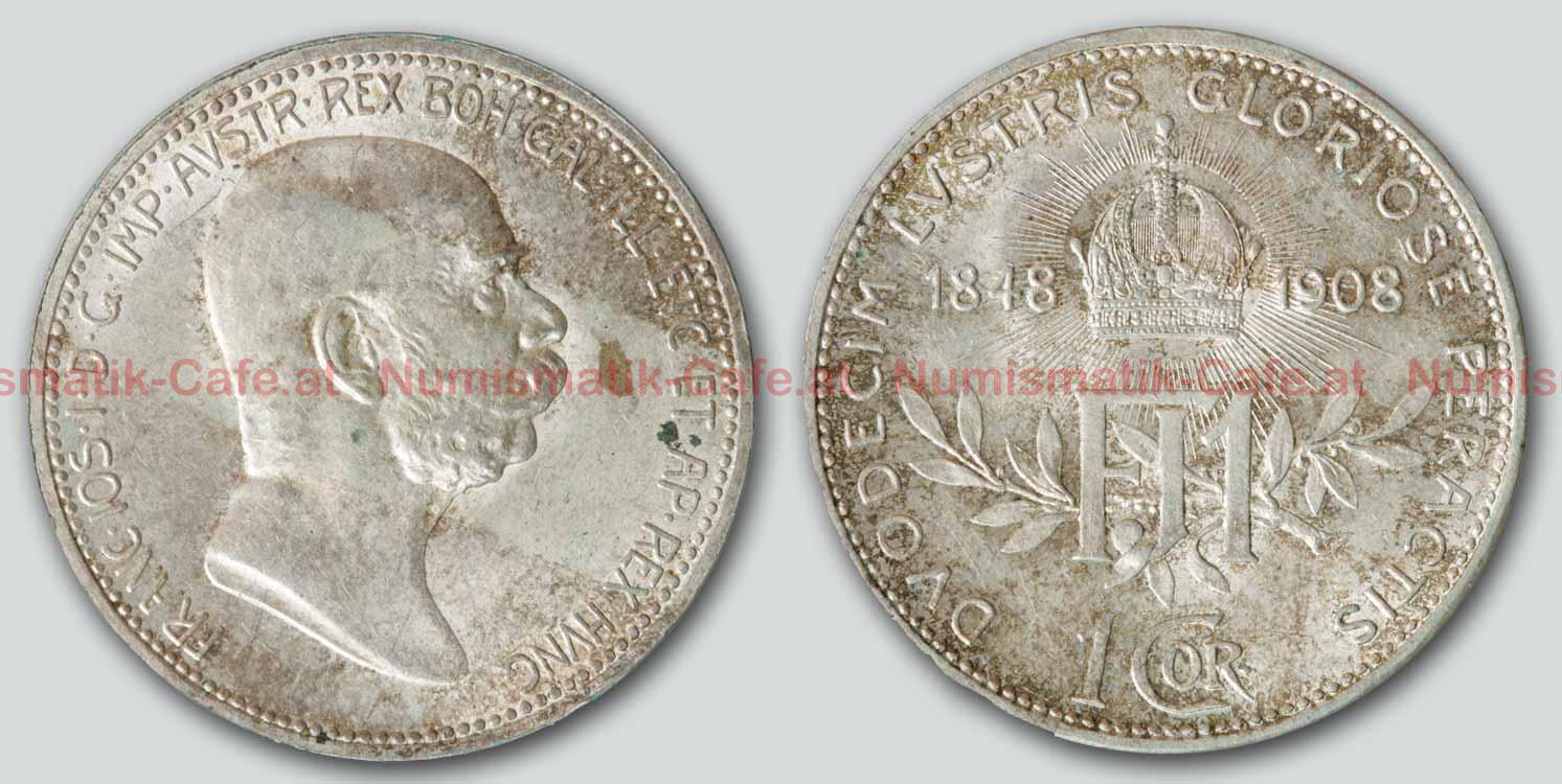| Bildbeschreibung: | 1 Krone, 1908 geprägt: 1908 Silber (835), 23mm, 5g VS: Kopfbild von Fraz Joseph I mit langer Halspartie nach rechts, FRANC IOS(eph) I D)ei) G(ratia) IMP(erator) AVSTR(iae) REX BOH(emiae) GAL(Iciae) ILL(yriae) ETC ET AP(ostolicae) REX HUN(gariae) RS: kekröntes Monogramm aus FJ1, Jahreszahlen Gedenkumschrift S#11 ANK#68 KM#2808 |