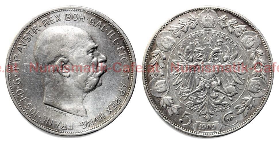 | Bildbeschreibung: | 5 Kronen (Cor.) 1909 Silber 0.900 (Ag), 24 g, 36 mm Av. Kopfbild mit kurzem Hals r., im Halsabschnitt Signatur St.Schwartz; Umschrift FRANC IOS I D G IMP AUSTR REX BOH GAL ILL ETC ET AP REX HUNG Rv. Bekrönter Doppeladler mit aufgelegtem Habsburger Wappen und Ordenskette im Perlkranz, darüber Wert QVINQVE CORONA, umgeben von fünf Kaiserkronen und Lorbeerzweigen, darunter Wert 5 Cor. und Prägejahr 1909. Randschrift VIRIBVS VNITIS (Mit vereinten Kräften) unterbrochen von Arabesken. S#16 KM#2813 |