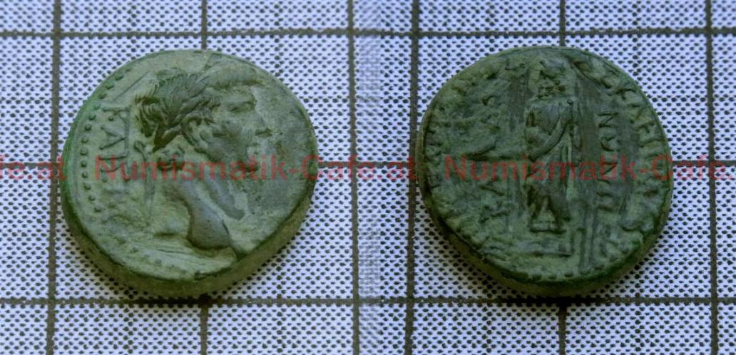 | Bildbeschreibung: | Zitat: AE19 // PHRYGIA - CADI A) KΛAYΔIOC KAICAP Belorbeerte Büste des Kaisers nach rechts R) ΔHMHTPIOY APTEMA Feld: lKAΔO HNΩN Zeus Laodikaios steht im Himation frontal, blickt nach links, hält in der Linken Zepter, in der ausgestreckten Rechten einen Adler Gewicht: 4,9g Ø: 19mm Referenz: RPC I/498; Sgl Aulock: 3685; SEAR: 456 |