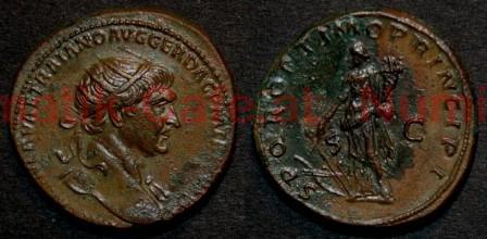 | Bildbeschreibung: | Obv. IMP CAES NERVAE TRAIANO AVG GER DAC P M TR P COS V P P, radiate head right Rev. S P Q R OPTIMO PRINCIPI S C, Fortuna standing left, holding cornucopiae and rudder on prow Mint: Rome, 103 AD RIC II 502 |
