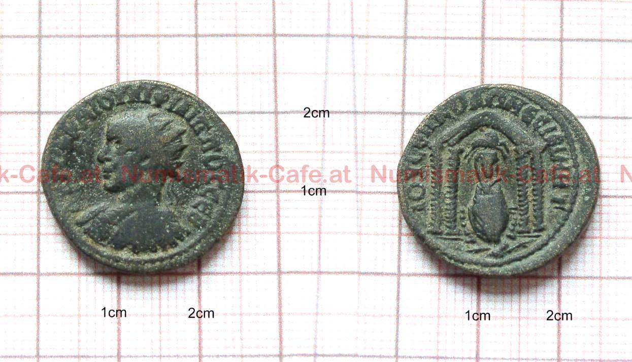 | Bildbeschreibung: | AE25 // NISIBIS / MESOPOTAMIA A) AVTOK KM IOYΛI ΦIΛIΠΠOC CEB Bartlose, gepanzerte Büste mit Strahlenkrone nach links R)IOY CEΠ KOΛΩ NECIBI MHT Viersäuliger Tempel, darinnen sitzt Tyche frontal, über ihr springt Widder (Aries?) nach rechts, den Kopf nach links gewendet. Vor ihr schwimmt Flußgott im Wasser Gewicht: 10,13g Ø: 25mm Referenz: BMC 22(corr, dort als Philippus I bezeichnet) SNG: Cop.240 (corr.dort ebenfalls als Philippus I bezeichnet) SNG Hunterlan 2448-50 Ex: Sgn J.S. Wagner Sammlung Ex: CNG e Auktion 224/Nr:494 |