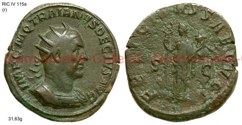| Bildbeschreibung: | Doppelsesterz / ROMA A) IMP C M Q TRAIANVS DECIVS AVG Gepanzerte Büste mit Strahlenkrone nach rechts R) FELICITAS SAECVLI SC Felicitas steht frontal, Kopf nach links, hält caduceus und cornucopiae Gewicht: 31,63g Referenz: RIC IV/III/115a |