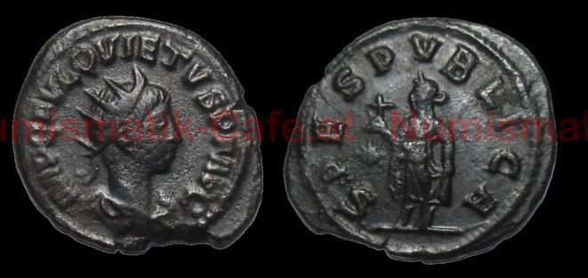 | Bildbeschreibung: | Antoninian A) IMP C FVL QVIETVS P F AVG Drapierte, gepanzerte Büste nach rechts R) SPES PVBLICA Spes geht nach links, hält Blume, rafft ihr Kleid RIC V/II/11 |