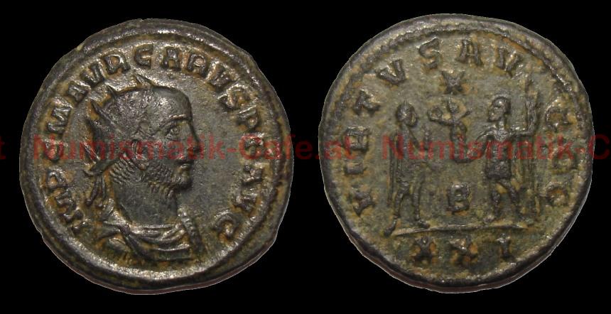 | Bildbeschreibung: | Antoninian / ANTIOCHIA A) IMP C M AVR CARVS PF AVG Drapierte u. Kürassierte Büste mit Strahlenkrone nach rechts R) VIRTVS AVGGG Abs.: XXI / Feld: Stern B Kaiser nach rechts, erhält Vicotoriaglobus von Jupiter gegenüber, dieser hält Szepter Referenz: RIC V/II/125 |
