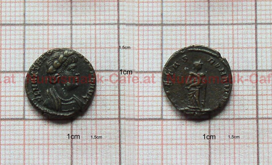 | Bildbeschreibung: | „Klein“-Follis/ A) FL MAX THEODORA AVG Drapierte, belorbeerte Büste nach rechts R) PIETAS ROMANA Pietas frontal hält Kind im Arm, blickt nach rechts Gewicht:1,5g Ø:15mm |