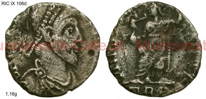 | Bildbeschreibung: | Siliqua/TREVERI A) DN EVGENIVS PF AVG Diademierte, drapierte, gepanzerte Büste nach rechts R) VIRTVS ROMANORVM Abs: TRPS Roma sitzt nach links, hält Speer und Globus, auf welchem Victoriola steht Gewicht: 1,16g Referenz: RIC IX/106d |