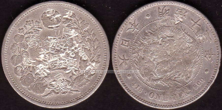 | Bildbeschreibung: | 1 Yen 1880 Material: Silber 900 / Kupfer 100 Durchmesser: 38,58mm Gewicht: 26,96g Randschrift: Keine / Riffelrand Auflage: 5,247,432 Kat.-Nr.: Schön: 6 KM: A25 JNDA: 01-10 |