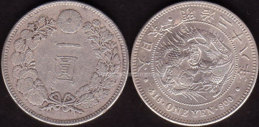 | Bildbeschreibung: | 1 Yen 1895 Material: Silber 900 / Kupfer 100 Durchmesser: 38,1mm Gewicht: 26,96g Randschrift: Keine / Riffelrand Auflage: 21,098,754 Kat.-Nr.: Schön: 6 KM: A25 JNDA: 01-10A |