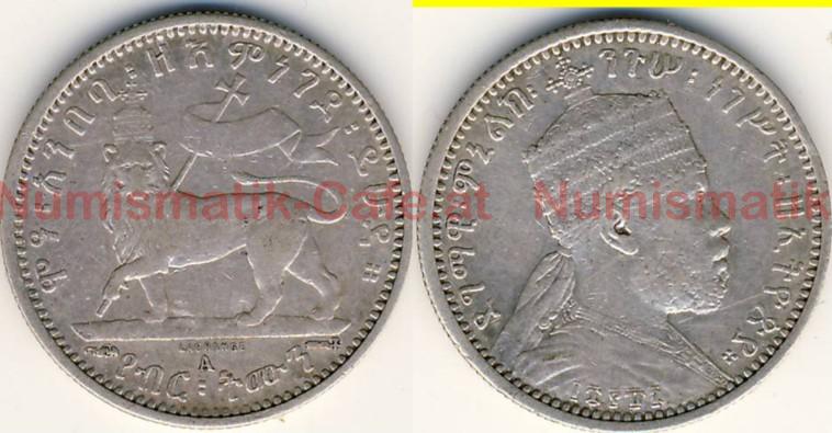 | Bildbeschreibung: | Kaiserreich Äthiopien Menelik II. EE 1882 - 1909 (AD 1889 - 1913) 1/8 Birr EE 1887 (AD 1894) Münzstätte Paris Ag (835), 3,52 g 19,95 mm geriffelter Rand KM # 2 |
