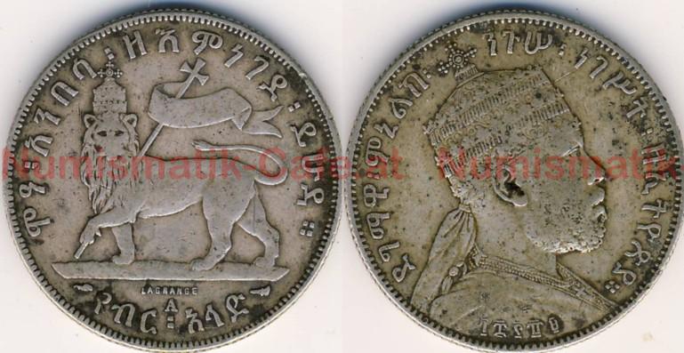 | Bildbeschreibung: | Kaiserreich Äthiopien Menelik II. EE 1882 - 1909 (AD 1889 - 1913) 1/2 Birr EE 1889 (AD 1896) Münzstätte Paris Ag (835) 14,02 g 30,6 mm geriffelter Rand KM # 4 |