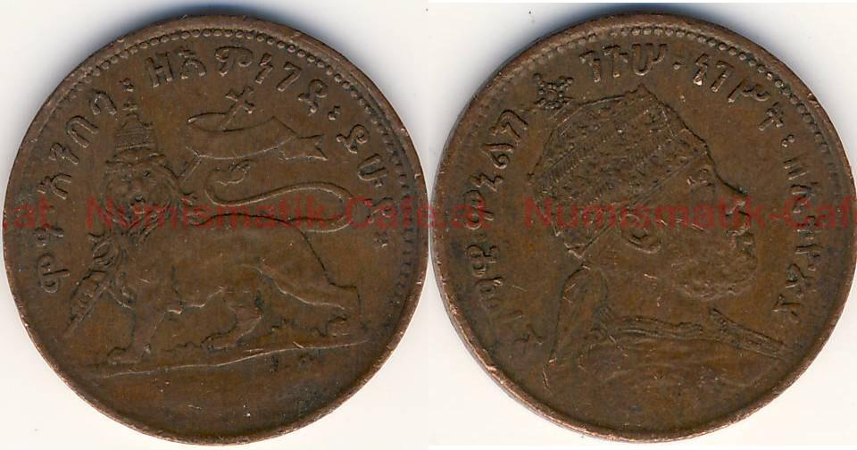 | Bildbeschreibung: | Kaiserreich Äthiopien Menelik II. EE 1882 - 1909 (AD 1889 - 1913) 1/32 Gersch (1 Besa) EE 1889 (AD 1896) Münzstätte Addis Abeba Cu-Sn, 2,94 g 20,5 mm, geriffelter Rand KM # 10 Bei diesem Stück ist von der ursprünglichen Wertangabe der Buchstabe ganz rechts noch zu erkennen. Diese Münzen wurden mit einem Stempel geprägt, der für die Prägung von 1/8-Birr-Münzen in Addis Abeba hergestellt wurde. Diese Münzen wurden dort jedoch nie geprägt. Das ursprüngliche Nominal wurde dabei im Stempel in 4 Stufen zerstört: 1. leicht unkenntlich (a) 2. stark unkenntlich (b) 3. fast vollständig entfernt (c,d) 4. restlos entfernt (e) Eventuell gibt es noch mehr Zwischenstufen. Da man jedoch relativ häufig auch stempelgleiche Wertseiten findet, scheinen die Übergänge nicht ganz so fließend zu sein, wie bisher angenommen. Interessant ist zudem, dass auch die Prägung der Jahreszahl mit zunehmender Verstümmelung der Wertangabe immer flauer wird, in Stufe 3 schon nicht mehr lesbar ist und in Stufe 4 - wie das falsche Nominal - völlig verschwunden ist. Der geriffelte Rand, der bei diesem Nominal und diesem Material ja völlig überflüssig ist, erklärt sich ebenso aus dem ursprünglichen Verwendungszweck der Stempel. |