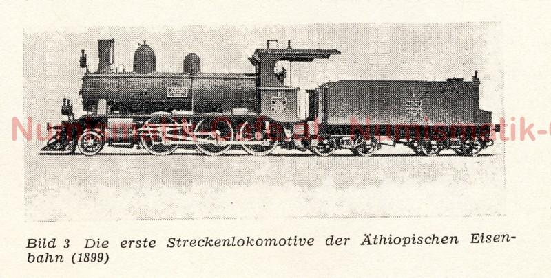 | Bildbeschreibung: | Die Rückseite der Medaille zeigt den Typ der oben abgebildete Lokomotive, eine Schlepptender-Dampflokmotive der Bauart 1’C. Es handelt sich dabei um eine von insgesamt 9 von der Schweizerischen Lokomotiv- und Maschinenfabrik (SLM) an Djibouti – Ethiopien gelieferten Maschinen. Diese in Winterthur angesiedelte Lokschmiede existiert auch heute noch unter dem Namen Stadler-Winterthur. Eigentlich wurden 11 Stücke dieser Bauart von SLM für Djibouti – Ethiopien gebaut, aber zwei davon gingen auf dem Seeweg verloren und wurden durch zwei andere mit gleicher Betriebsnummer ersetzt. Die Lieferungen der Maschinen erstreckten sich von AD 1899 bis 1912, weshalb für die AD 1903 geprägte Medaille nur eine Bahn-Nummer von 1-6 in Frage kommt. Das Photo ist der Ausgabe 12/1965 der Zeitschrift “Der Modelleisenbahner“ – im Transpress Verlag in Ost-Berlin erschienen – entnommen. Es stammt aus einem sehr lesenswerten Beitrag von Gerhard Arendt “Die Eisenbahnen in Äthiopien, Eritrea und Somalia“. Bild und Text mit freundlicher Genehmigung von Münz-Goofy! |