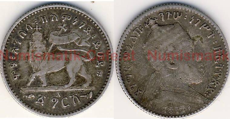 | Bildbeschreibung: | Kaiserreich Äthiopien Menelik II. EE 1882 - 1909 (AD 1889 - 1913) 1 Gersch EE 1889 (AD 1896) Münzstätte Paris (Das Füllhorn war ursprünglich Zeichen des Münzdirektors, später allgemeines Kennzeichen für die Prägestätte Paris 1880 - heute. Das Münzmeisterzeichen Fackel wurde von 1896 - 1930 benutzt.), 1.000.000 Ag (835), 1,40 g 16,2 mm geriffelter Rand KM # 12 Diese Münze wurde Gersch (osmanische Münzeinheit), Piaster (europäischer Name des Gersch) oder Mahallak (jemenitische Münzeinheit) genannt. Ein Gersch war zunächst 1/20 Birr (Thaler), wurde später jedoch von Menelik auf 1/16 Birr (Thaler) aufgewertet. Wann genau habe ich bislang leider nicht feststellen können. Der Jahrgang EE 1889 aus Paris ist wesentlich schwieriger zu finden, als es die Auflage vermuten lässt. |