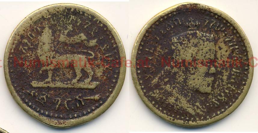 | Bildbeschreibung: | Kaiserreich Äthiopien Menelik II. EE 1882 - 1909 (AD 1889 - 1913) Gersch EE 1887 (AD 1894) Münzstätte Paris (angegeben, aber fraglich) !!! Cu-Sn, 6,34 g !!! 26,8 mm, glatter Rand KM # - Gill # - Dieses Stück ist deutlich größer und schwerer als das übliche M03, hat aber die gleichen Abbildungen und Inschriften. Auch diese "Münze" kann frühestens EE1889 entstanden sein, da sie als "privy mark" die Fackel zeigt, die erst in Verlauf des Jahres AD 1896 eingeführt wurde. AD 1894 hätte das Rutenbündel (Fasces) abgebildet sein müssen, wie es bei dem Stück zu 1/8 Birr von EE 1887 gut zu sehen ist. Auch diese "Münze" war wohl ursprünglich ein Medaillon, bei der eine angebrachte Öse später entfernt wurde, möglicherweise um sie als Geldstück zu verwenden. Umlaufspuren sind ja reichlich vorhanden. Die Herkunft aus der Prägestätte Paris ist sicherlich stark zu bezweifeln. |