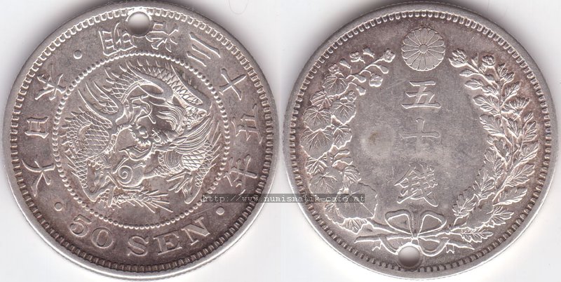 | Bildbeschreibung: | 50 Sen 1902 Drachen Material: Silber 800 / Kupfer 200 Durchmesser: 31,0mm Gewicht: 12,50g Randschrift: Keine / Riffelrand Auflage: 1,023,280 Kat.-Nr.: Schön: 5 KM: 25 JNDA: 01-14 |