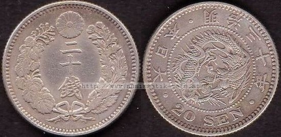 | Bildbeschreibung: | 20 Sen 1897 Drachen Material: Silber 800 / Kupfer 200 Durchmesser: 23,50mm Gewicht: 5,39g Randschrift: Keine / Riffelrand Auflage: 7,516,448 Kat.-Nr.: Schön: ? KM: 24 JNDA: 01-21 |