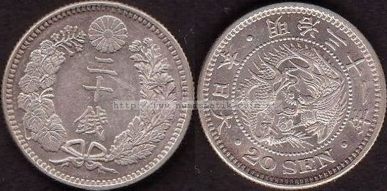 | Bildbeschreibung: | 20 Sen 1898 Drachen Material: Silber 800 / Kupfer 200 Durchmesser: 23,50mm Gewicht: 5,39g Randschrift: Keine / Riffelrand Auflage: 17,984,212 Kat.-Nr.: Schön: ? KM: 24 JNDA: 01-21 |