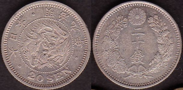 | Bildbeschreibung: | 20 Sen 1876 Typ 2 Drachen Material: Silber 800 / Kupfer 200 Durchmesser: 23,50mm Gewicht: 5,39g Randschrift: Keine / Riffelrand Auflage: zusammen mit Typ 1 = 9,200,892 Kat.-Nr.: Schön: ? KM: 24 JNDA: 01-21 das links endende Schleifenband zeigt Richtung Randstab! |