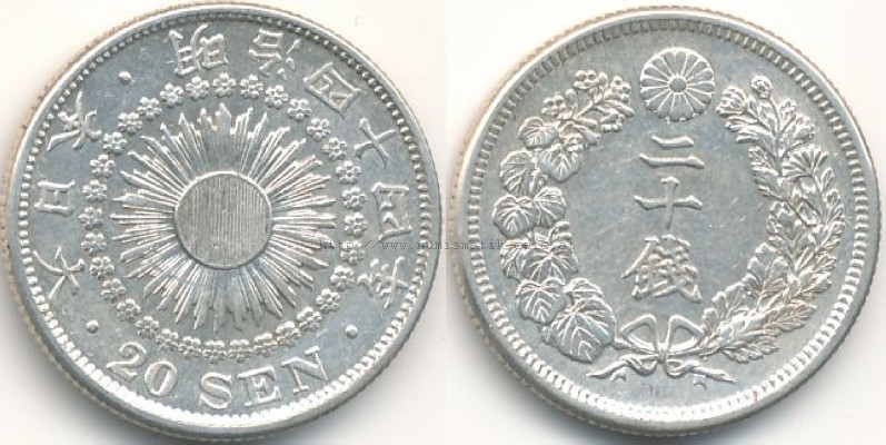 | Bildbeschreibung: | 20 Sen 1911 Sonne Material: Silber 800 / Kupfer 200 Durchmesser: 20,30mm Gewicht: 4,05g Randschrift: Keine / Riffelrand Auflage: 500,000 Kat.-Nr.: Schön: 8 KM: 30 JNDA: 01-22 |