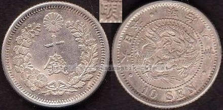 | Bildbeschreibung: | 10 Sen 1875 Typ 2 Drachen Material: Silber 800 / Kupfer 200 Durchmesser: 17,57mm Gewicht: 2,70g Randschrift: Keine / Riffelrand Auflage: zusammen mit Typ 1 = 8,977,419 Kat.-Nr.: Schön: 3 KM: 23 JNDA: 01-24 unvollständiges Zeichen für die Ära Meiji (vereinfachte Schreibweise, bzw.: fehlender Verbindungsstrich zwischen den 2 Teilen des Schriftzeichen) |